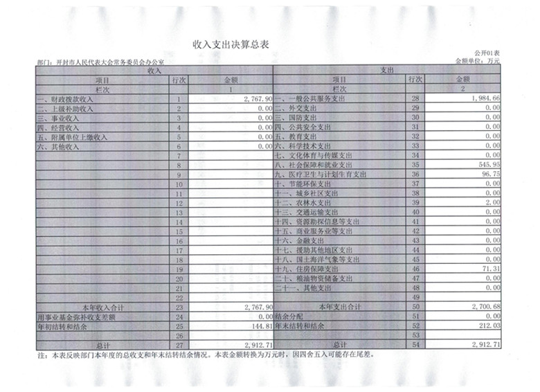 2018年度收、支总计均为2,912.71万元。与上年度相比,收、支总计各增加535.09万元,增长22.51%。主要原因是:1、加开一次人代会;2、人员经费增加。