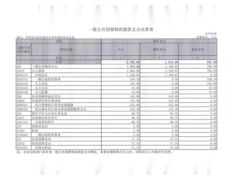 2018年度一般公共预算财政拨款支出2,700.68万元,占本年支出合计的100%。与上年度相比,一般公共预算财政拨款支出增加467.87万元,增长20.95%。主要原因是:1、加开一次人代会;2、人员经费增加。